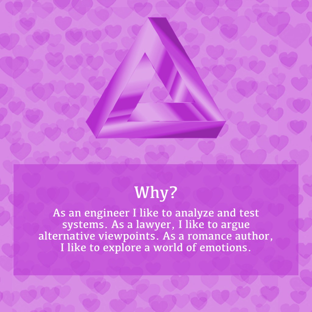As an engineer, I like to analyze and test systems. As a lawyer, I like to argue alternative viewpoints. As a romance author, I like to explore a world of emotions.